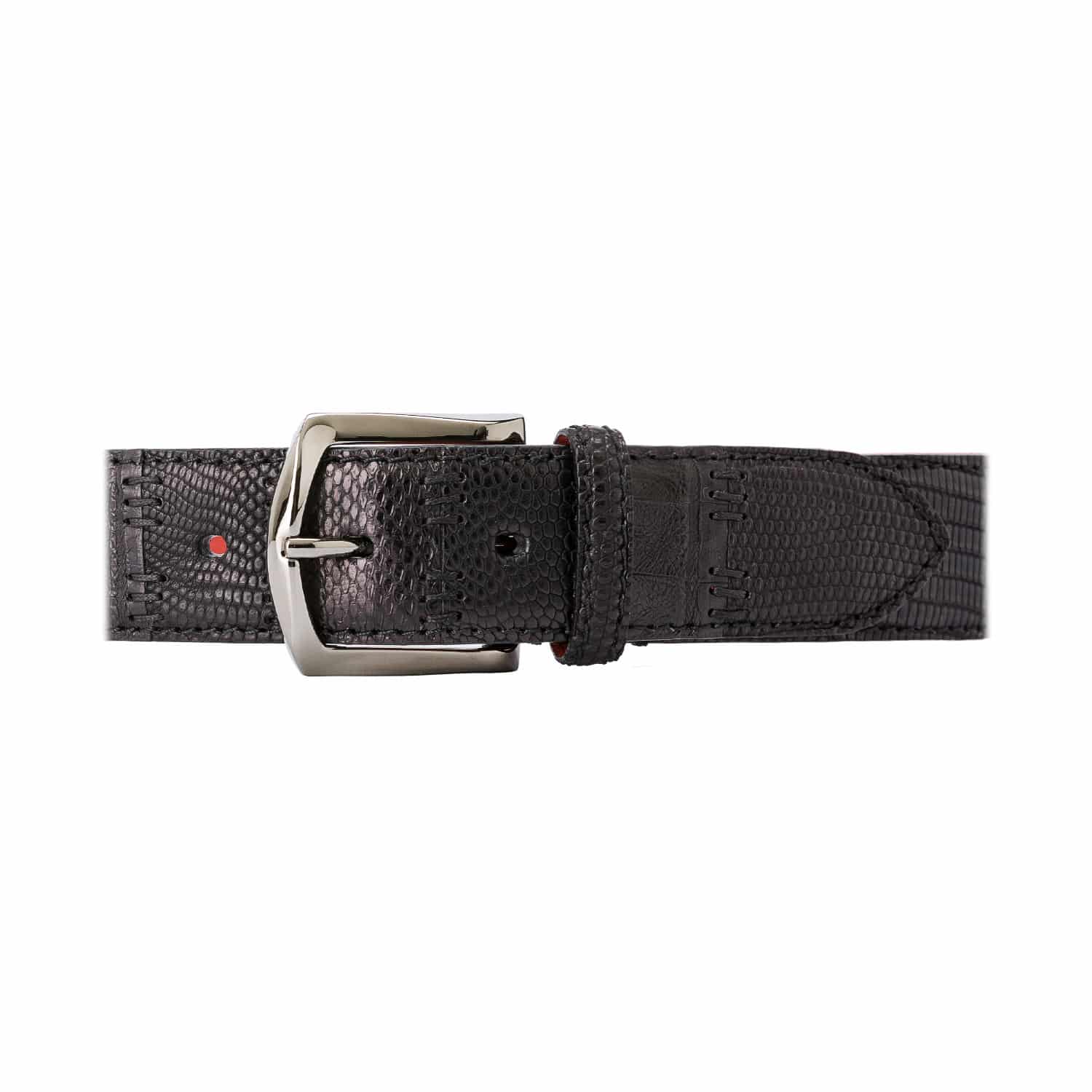 Handcrafted in Italy from genuine lizard leather, this belt offers a rich natural grain and an elegant stitched finish. The soft nubuck lining provides superior comfort, while the gold-tone solid brass buckle — nickel-free — adds understated luxury. A versatile choice for refined dressing.